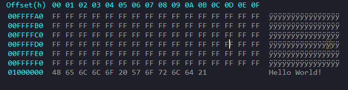 Now assemble the buildfile again, and take a look in HxD. As expected, you have Hello World! at 0x1000000, and Hellow Orld!HelloWorld! at 0x1000050. But what if we wanted the two Hello Worlds together?