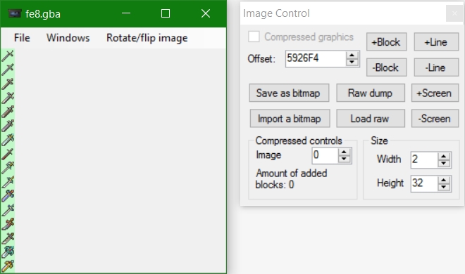 The Image Control window has a box in its lower-left corner that has two things in it: Image and Amount of blocks added. When you open a ROM in GBAGE, it counts the number of images it finds, and assigns each one a number based on the order in which the images are found. In the image above, notice that the image box displays that the image in numbered "0". Use the up and down buttons to quickly navigate compressed images within the ROM. You can also enter a known image number into the box and hit enter to immediately go to that image. Deleting or adding images to the ROM may change these numbers, so be careful. Furthermore, this box only applies to compressed images. The Amount of blocks added note shows how many pixels or tiles needed to be added to the image to display a rectangle.