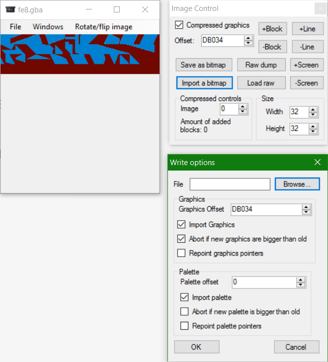 This window allows you to import .gif, .png, and .bmp images. The Graphics section is where you specify the offset to write to. You have the option of specifying whether or not to abort if the image is larger than what you are replacing, but that only matters if you are importing an image over an existing one. When inserting images into free space, uncheck the box. Also, there is an option to repoint existing pointers to the offset given by the Image Control window to point to the new graphic. When importing a graphic, having the Compressed graphics box checked will insert the graphic using lz77 compression. Leaving it unchecked will insert the graphic as uncompressed.