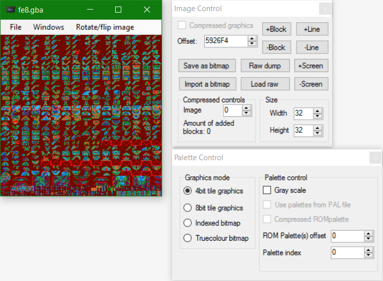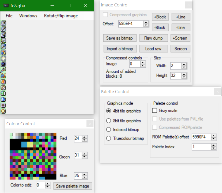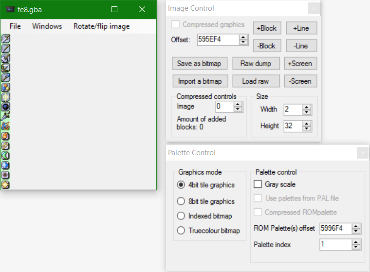 So, GBAGE does not know where the palette for these icons is by default. Just like the Image Control window, here is a breakdown of the features: