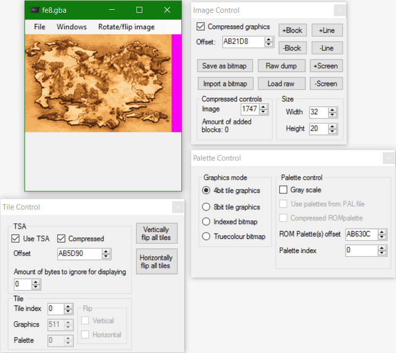 After opening a ROM, you gain access to the Windows and Rotate/flip image tabs.