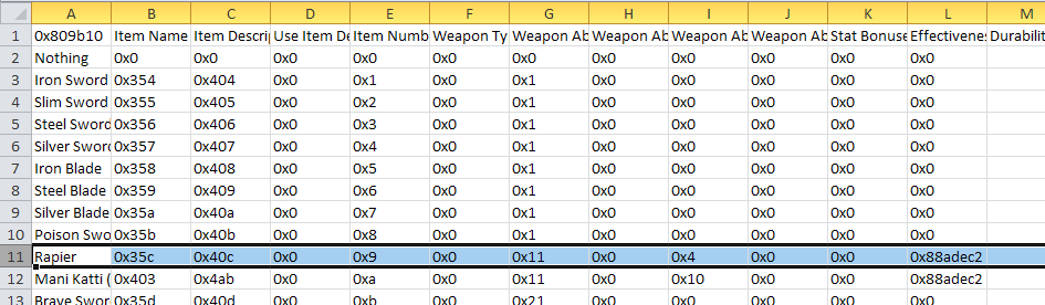 The best part of this is that you can actually use definitions in your spreadsheets! For example, let's take Eirika's Rapier and make it an indestructible, brave weapon. Just for the sake of learning, of course.