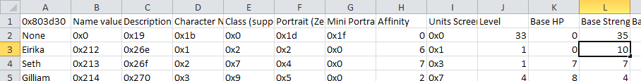 As you can see, each character is a row of the table, and each row is split into columns for the properties we can edit. We are editing Eirika's Base Strength, so we click that cell and type 10.